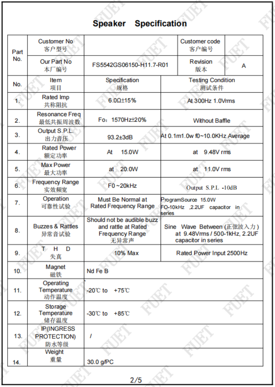 阻抗 6.0Ω±15% At 300Hz 1.0Vrms